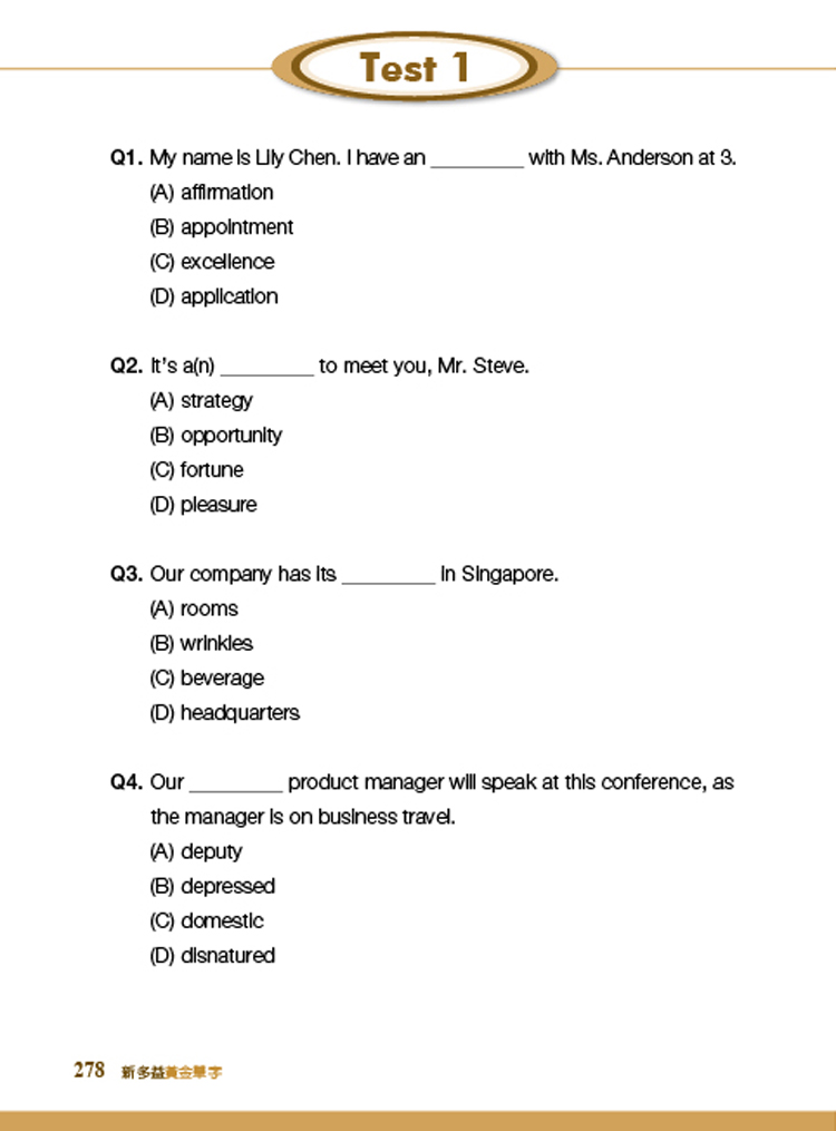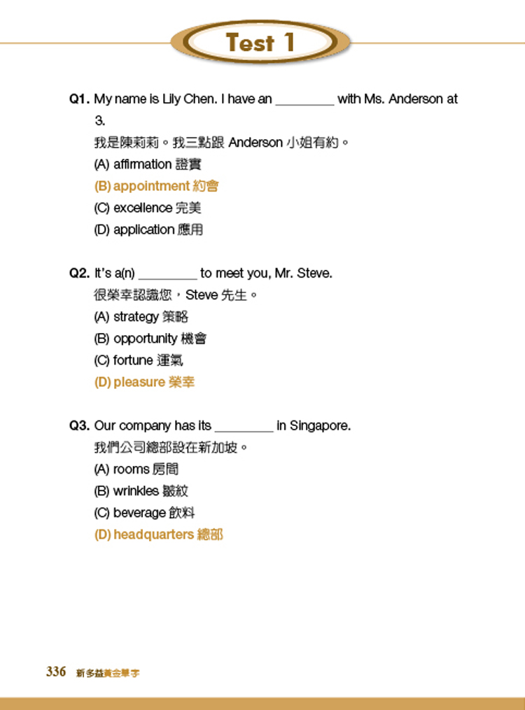 1. 12 回單字測驗 + 精闢解析:單字測驗模擬新多益實際出題方式及測驗難度,輔以精闢解析,徹底提升新多益單字深度與廣度。