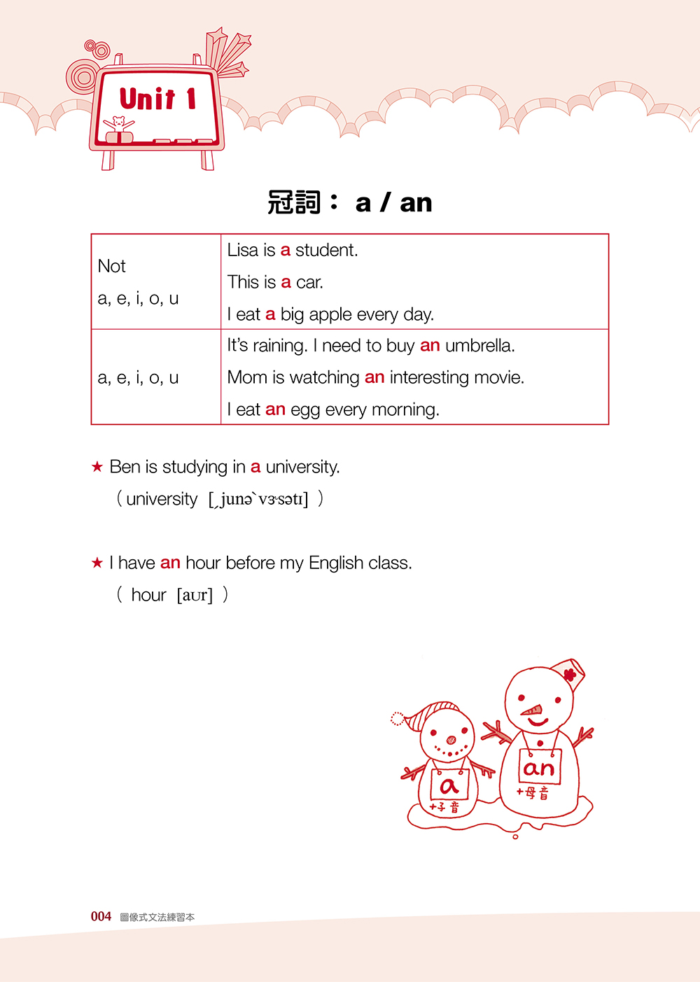 1.文法主題系統學習:完整收錄 14 大文法重點,循序漸進建構文法觀念。 2.生動圖像加深記憶:圖像表格輔助一目了然,將複雜的文法規則簡單化。 3.題型活潑加強運用:多樣化的題型設計與呈現,加強文法實際運用能力。 4.複習單元有效統整:穿插複習統整比較相似文法,釐清時態的模糊地帶。
