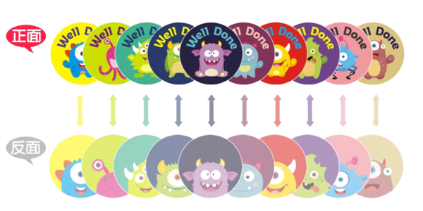 鮮豔又吸睛的圓形獎勵小卡 共收錄 10 種不同風格的小怪獸圖案 每張小卡都搭配 Well Done 的鼓勵小語,替孩子記錄努力與進步 圖案有雙面,背面可蓋章或書寫評語