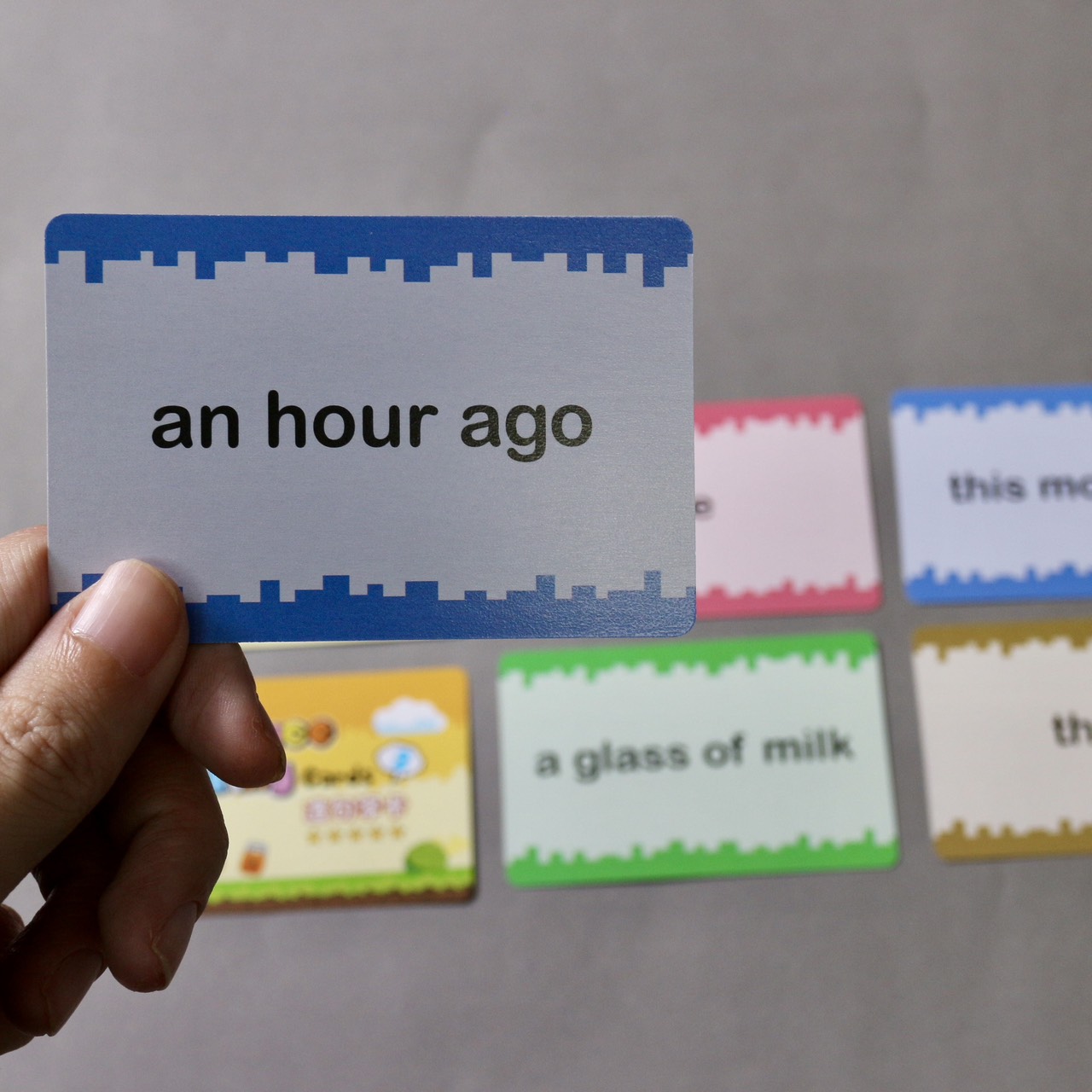 主詞、過去式動詞、受詞、時間副詞卡片各 13 張,像收集遊戲道具一樣,逐步完成句子挑戰。