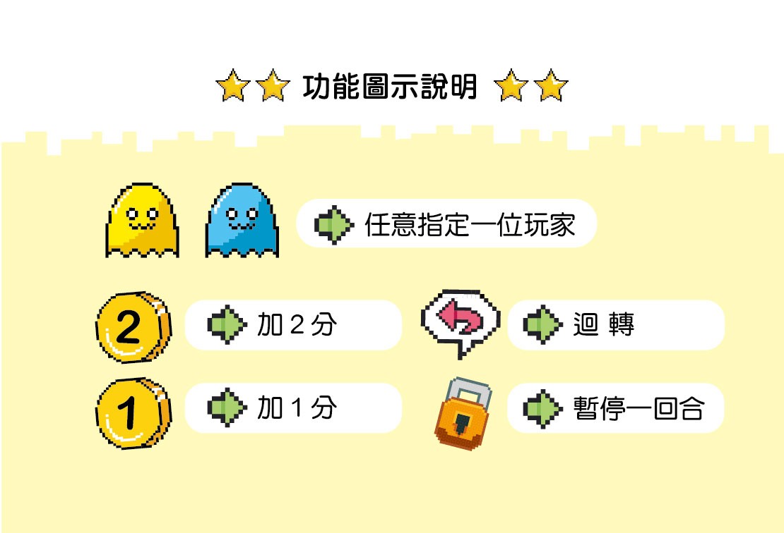 每張卡片都有精心設計的遊戲功能圖示【迴轉🔄、暫停⏸️、指定🎯等】,讓遊戲更具挑戰與趣味!