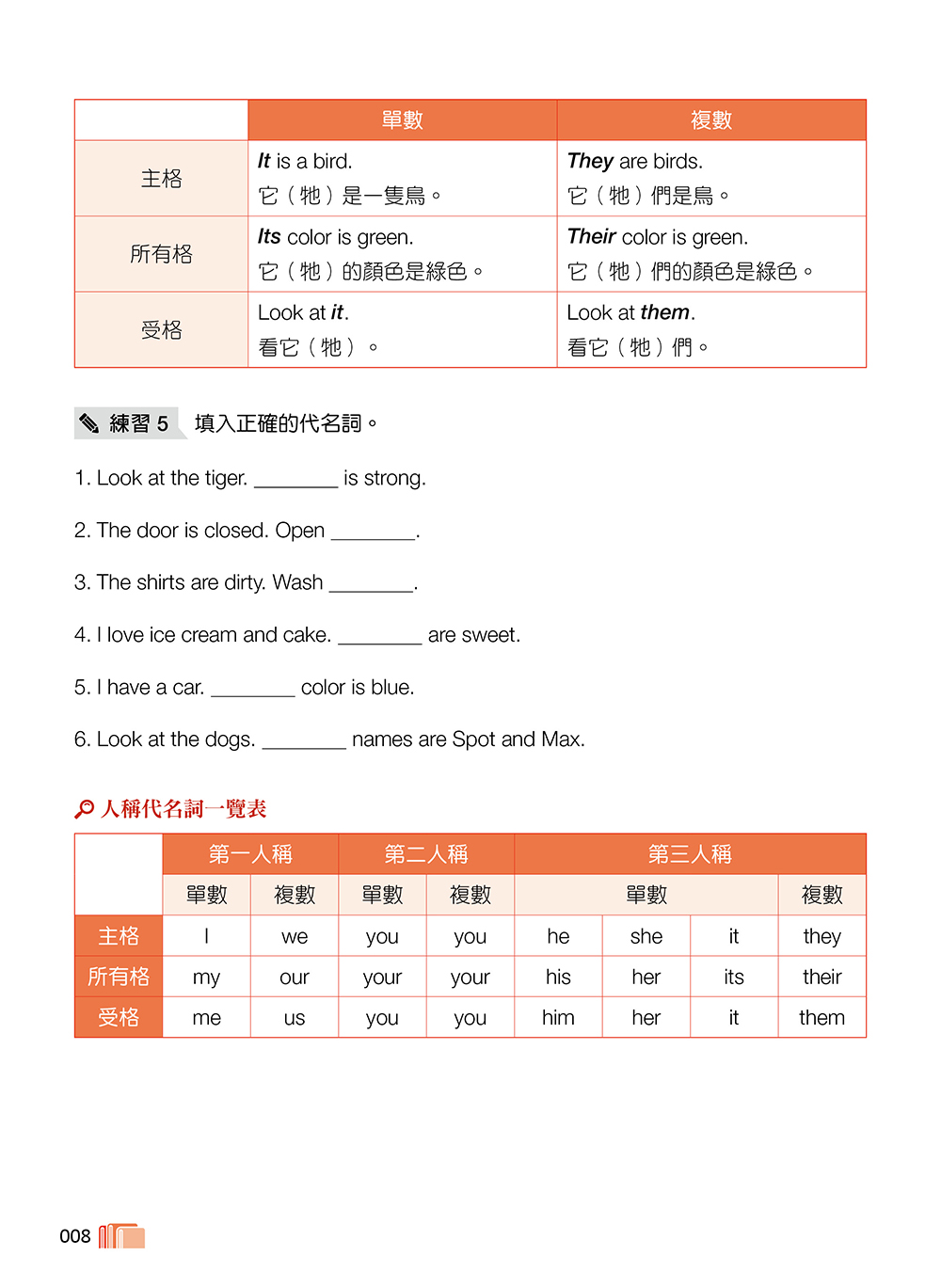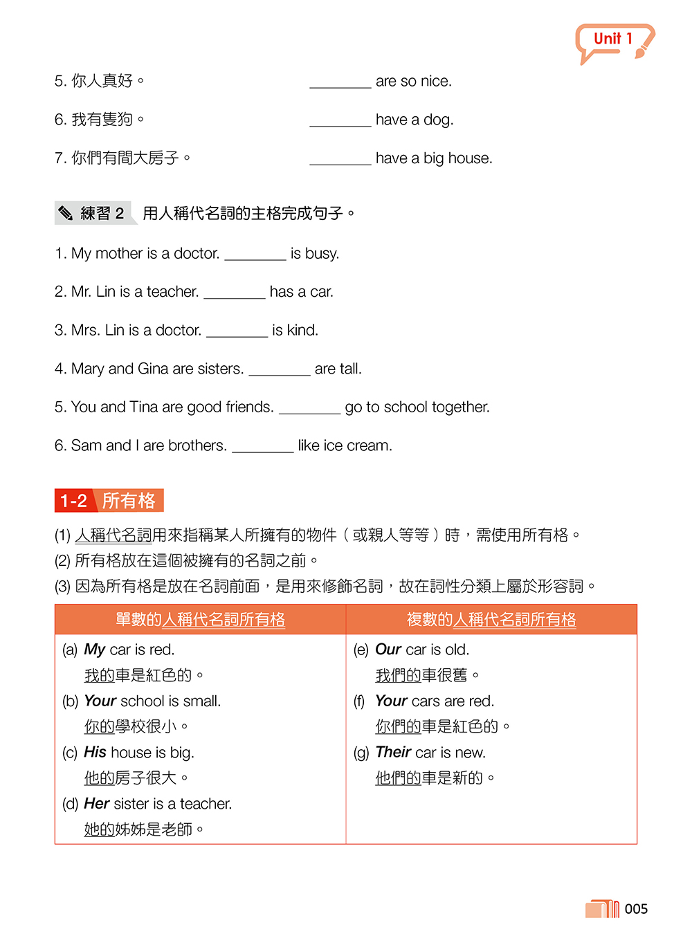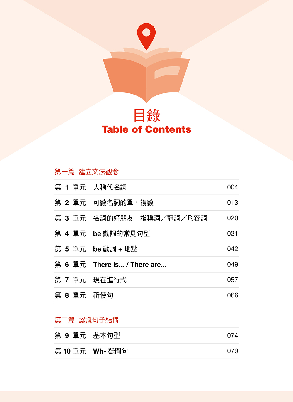 本書目錄 第一篇 建立文法觀念 第 1 單元 人稱代名詞 第 2 單元 可數名詞的單、複數 第 3 單元 名詞的好朋友──指稱詞/冠詞/形容詞 第 4 單元 be 動詞的常見句型 第 5 單元 be 動詞 + 地點 第 6 單元 There is… / There are… 第 7 單元 現在進行式 第 8 單元 祈使句