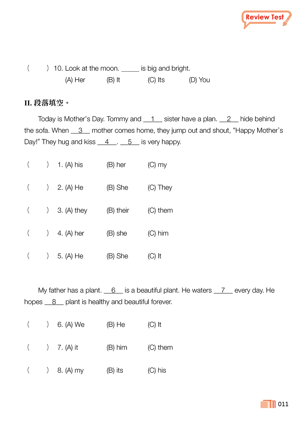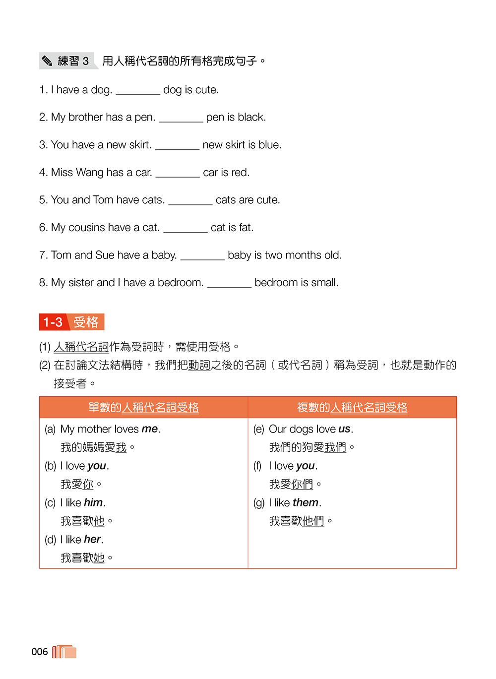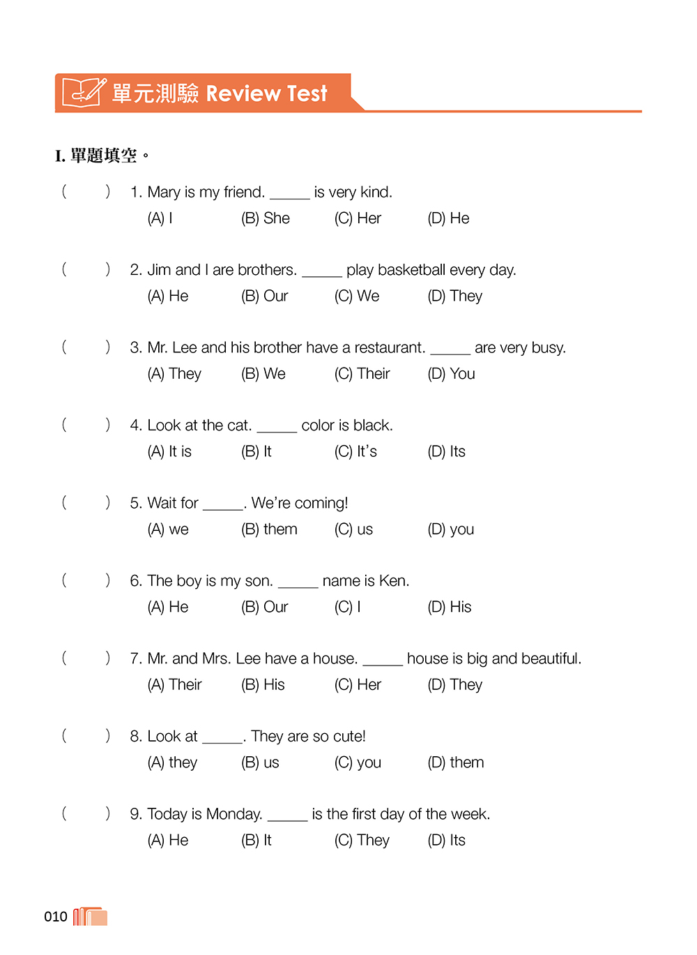 本書目錄 第一篇 建立文法觀念 第 1 單元 人稱代名詞 第 2 單元 可數名詞的單、複數 第 3 單元 名詞的好朋友──指稱詞/冠詞/形容詞 第 4 單元 be 動詞的常見句型 第 5 單元 be 動詞 + 地點 第 6 單元 There is… / There are… 第 7 單元 現在進行式 第 8 單元 祈使句