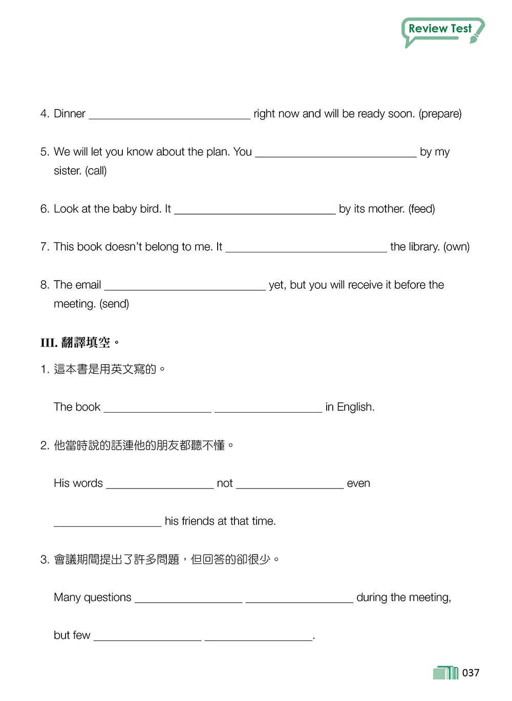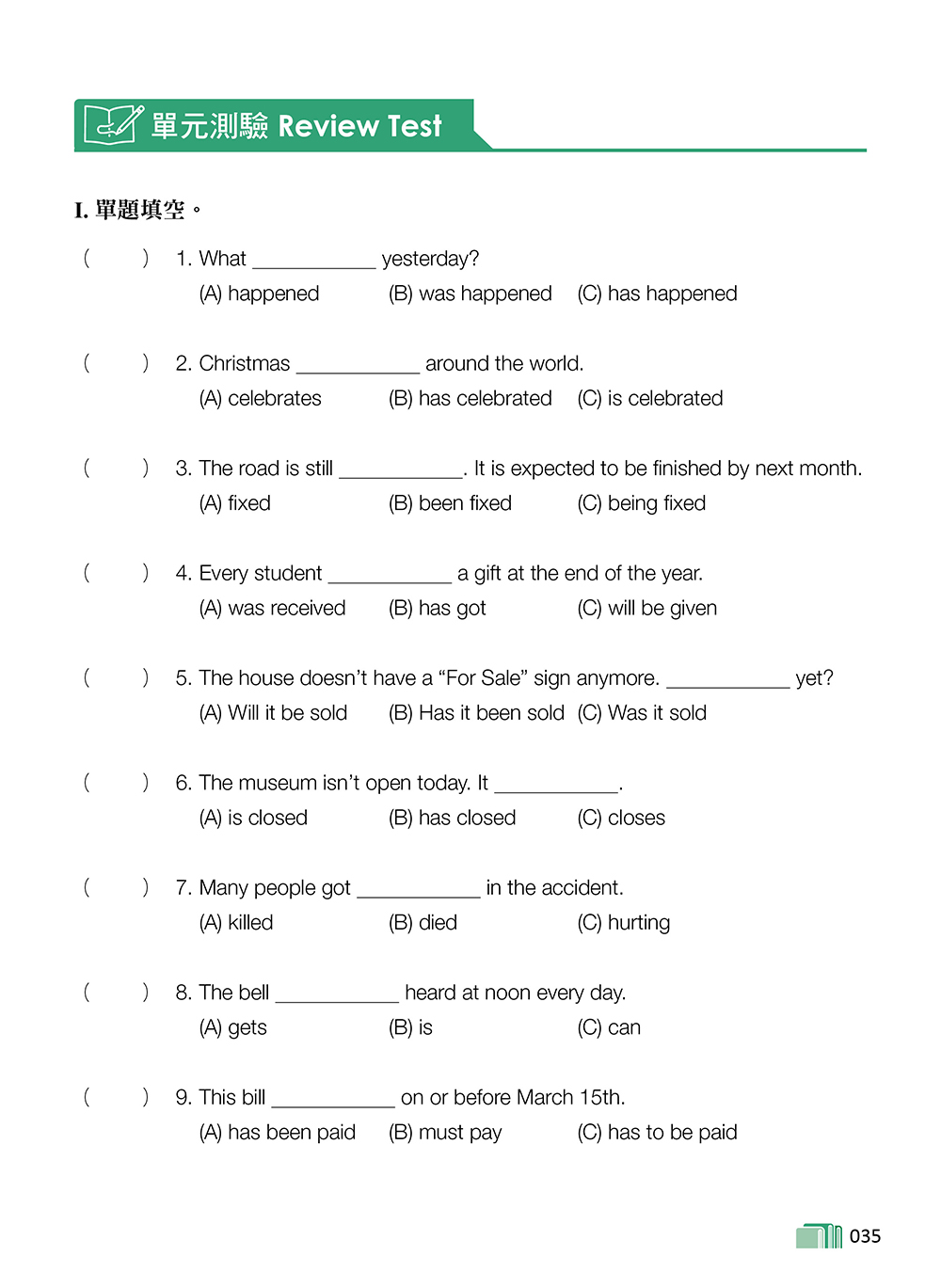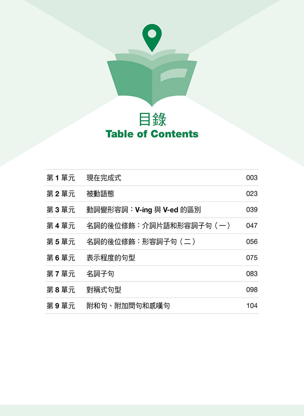 本書目錄 第 1 單元 現在完成式 第 2 單元 被動語態 第 3 單元 動詞變形容詞:V-ing 與 V-ed 的區別 第 4 單元 名詞的後位修飾:介詞片語和形容詞子句(一) 第 5 單元 名詞的後位修飾:形容詞子句(二) 第 6 單元 表示程度的句型 第 7 單元 名詞子句 第 8 單元 對稱式句型 第 9 單元 附和句、附加問句和感嘆句