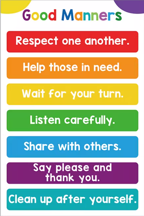 專為教室佈置與學生品格教育設計 此海報內容涵蓋多項重要的教室行為規範 如尊重他人、耐心等候、認真傾聽、懂得分享與保持環境整潔等 以簡單易懂的英文短句搭配色彩鮮明、吸睛的設計,幫助學生快速理解並記住正確行為。