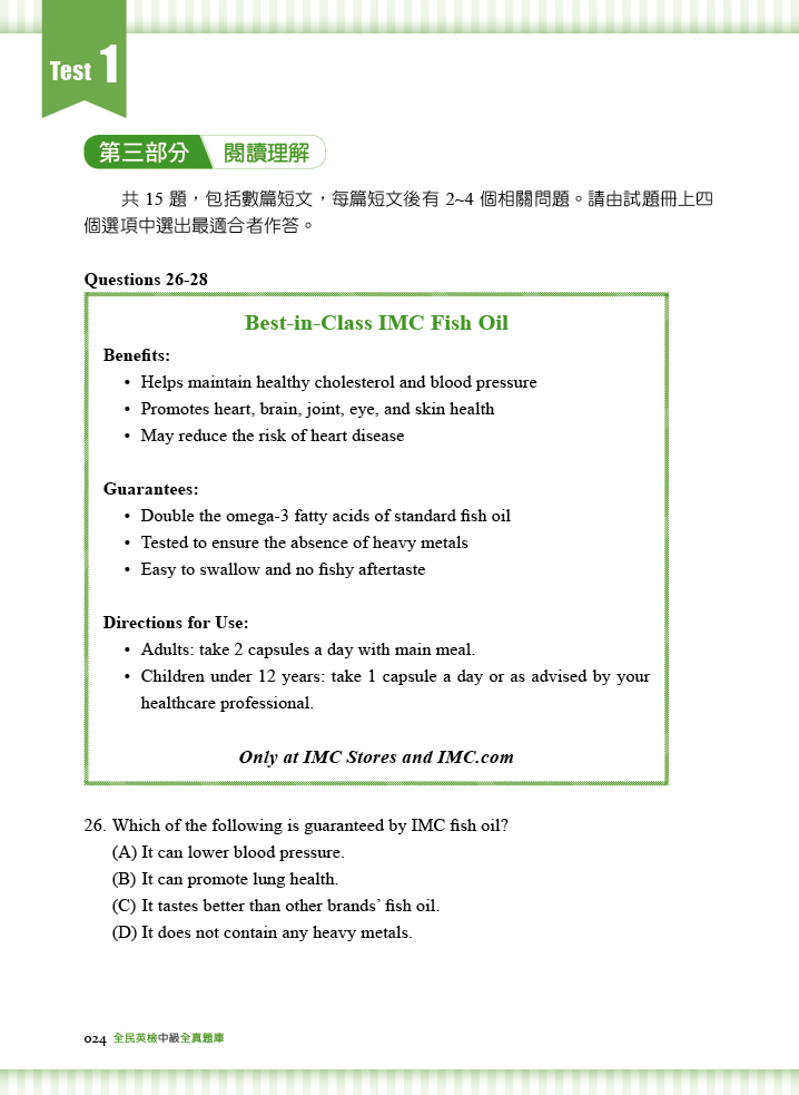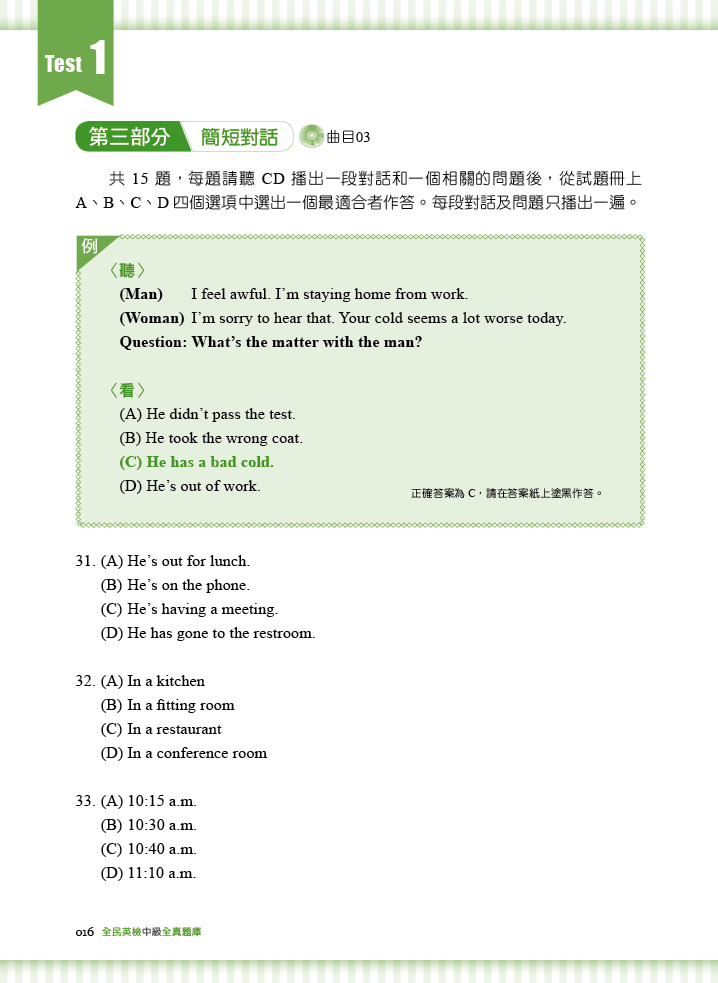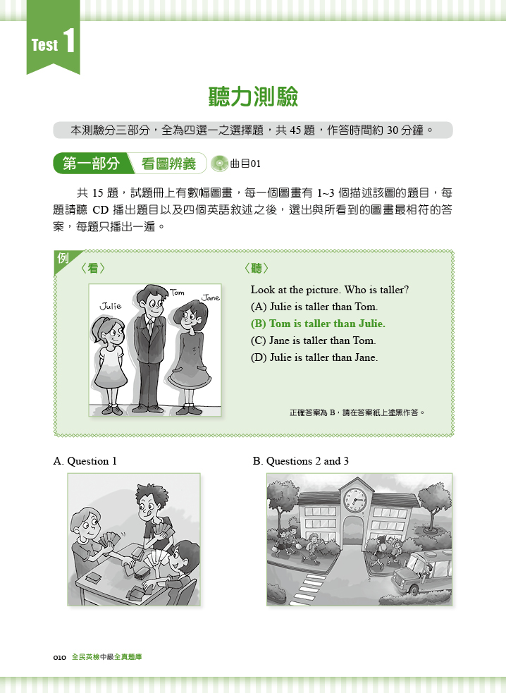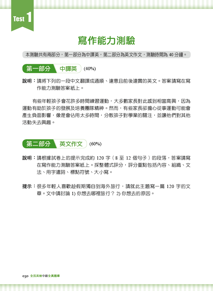 本書由中、外籍英語教師聯合撰寫。中籍教師針對台灣考生弱點出題,外籍教師幫助學生掌握最道地的英語用法,每回測驗內容完善,命中精準度高。
