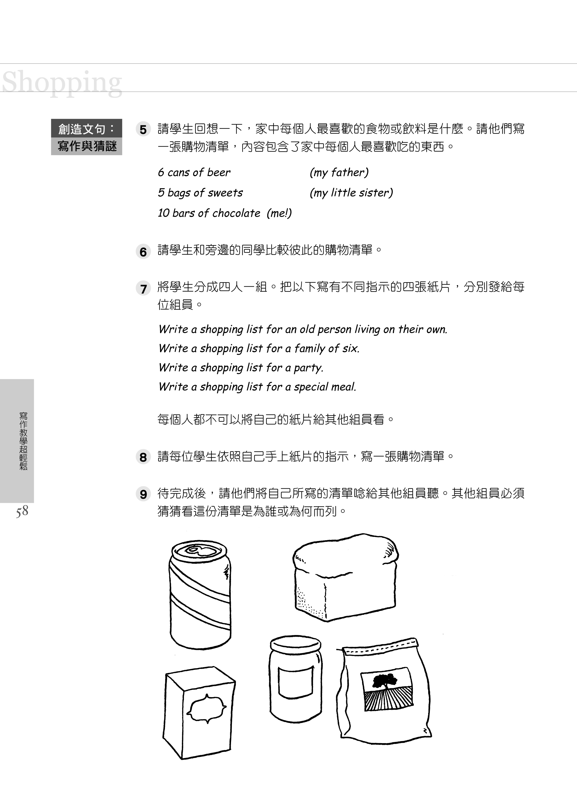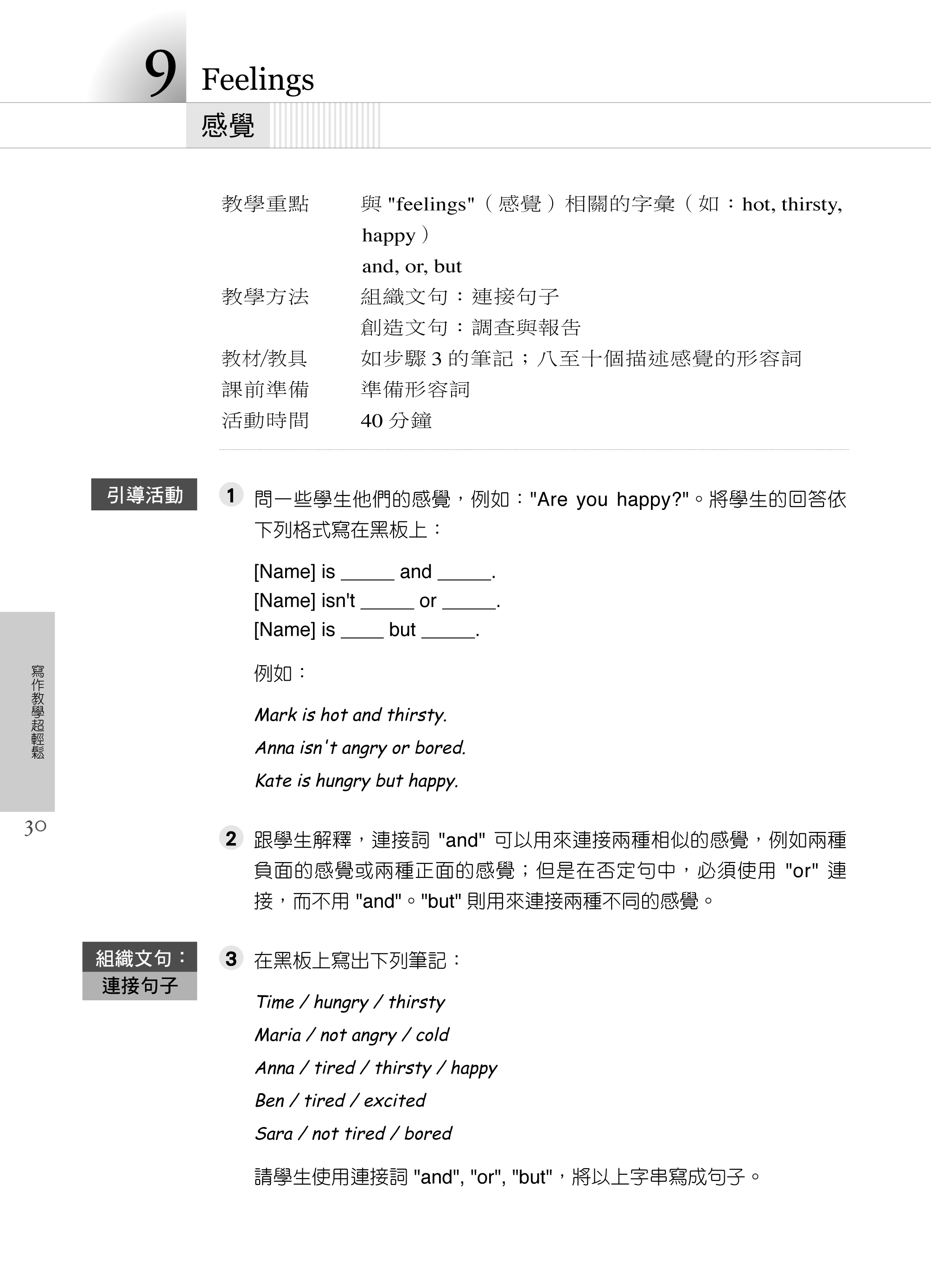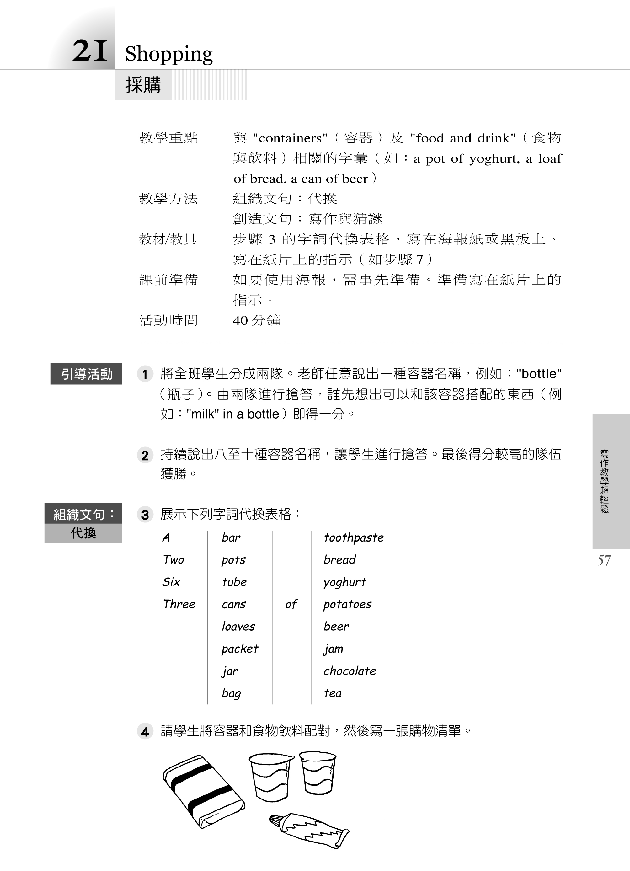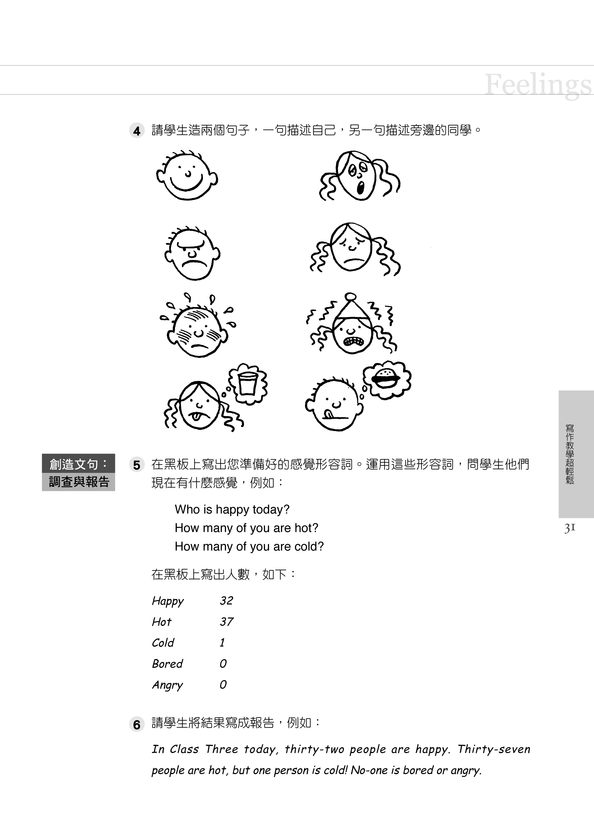 本套書共分為五冊,包含聽、說、讀、寫等四部份,每一冊的單元皆以不同主題分類,從最基礎的問候、數字到較進階的描述,一應俱全。 每個單元都包含一個活動,詳細列出活動前的準備事項、主旨和所需時間,活動中該注意的事情及活動後的後續反應等,可說是教授初級英語教師最佳的教學指南。