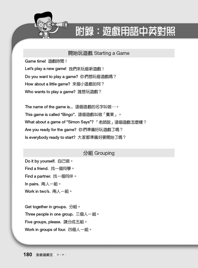 101個最 FUN 的英語課堂遊戲! 本書收錄的教學遊戲,不僅按照英語學習最重要的聽說讀寫技能分類,且排序由易到難,適用於各種程度的班級,教師可視不同教學需求安排運用,幫助學生循序漸進地學習。附贈的遊戲教學 DVD,由林群峰老師親自示範遊戲進行方式,活動步驟一目瞭然。一書在手,讓教師備課更輕鬆,學生上課更專注。