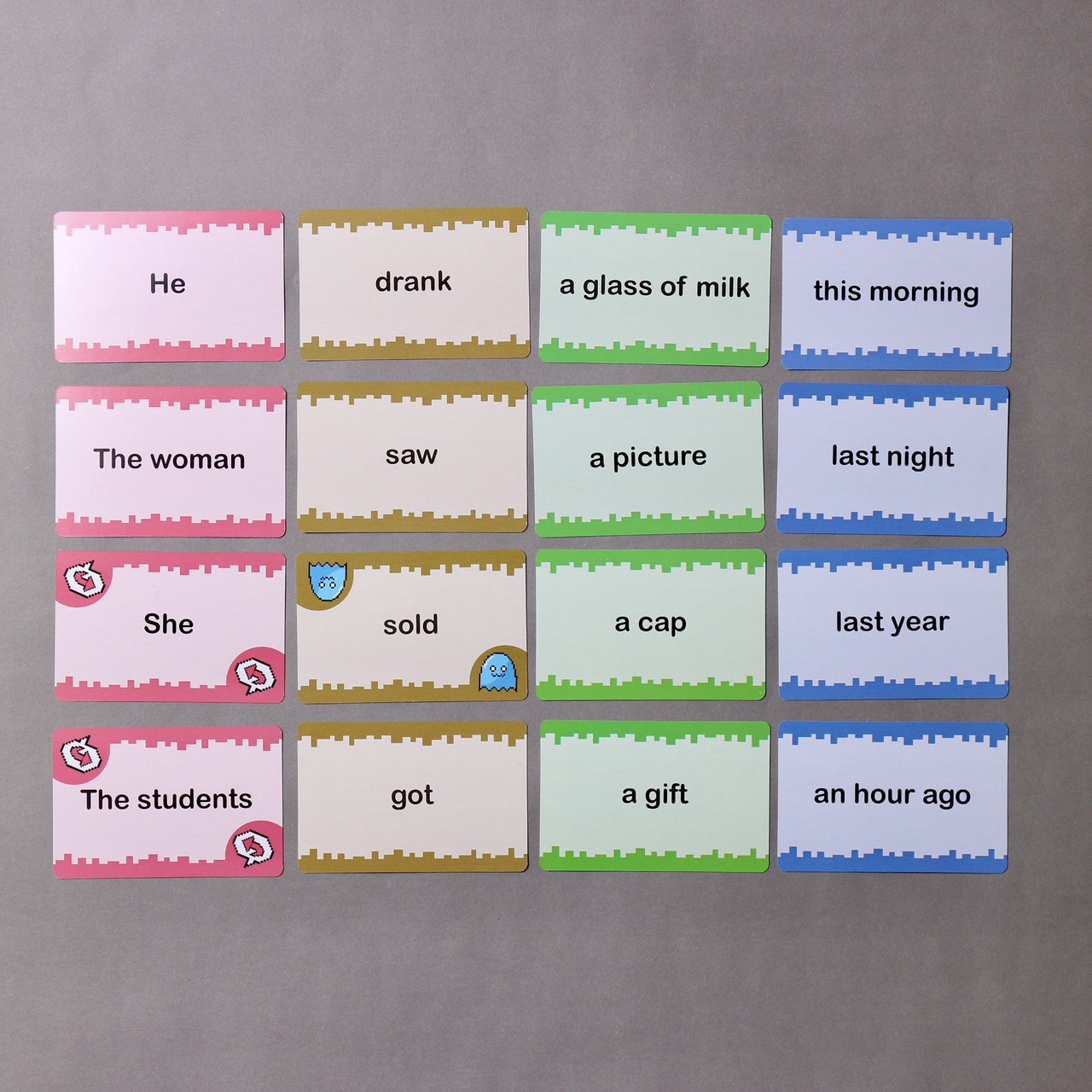 主詞、過去式動詞、受詞、時間副詞卡片各 13 張,像收集遊戲道具一樣,逐步完成句子挑戰。