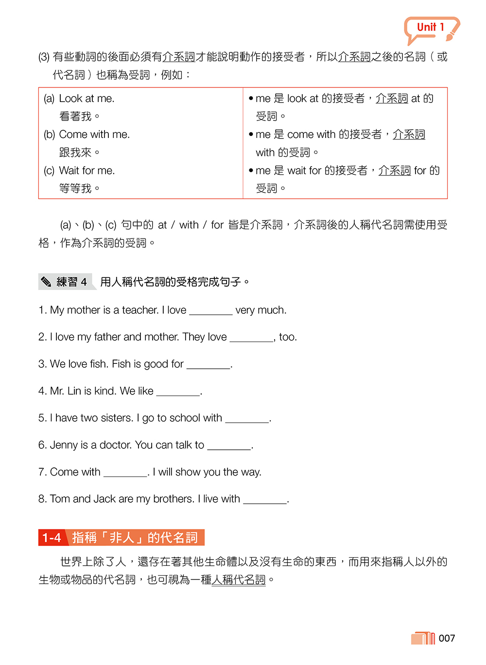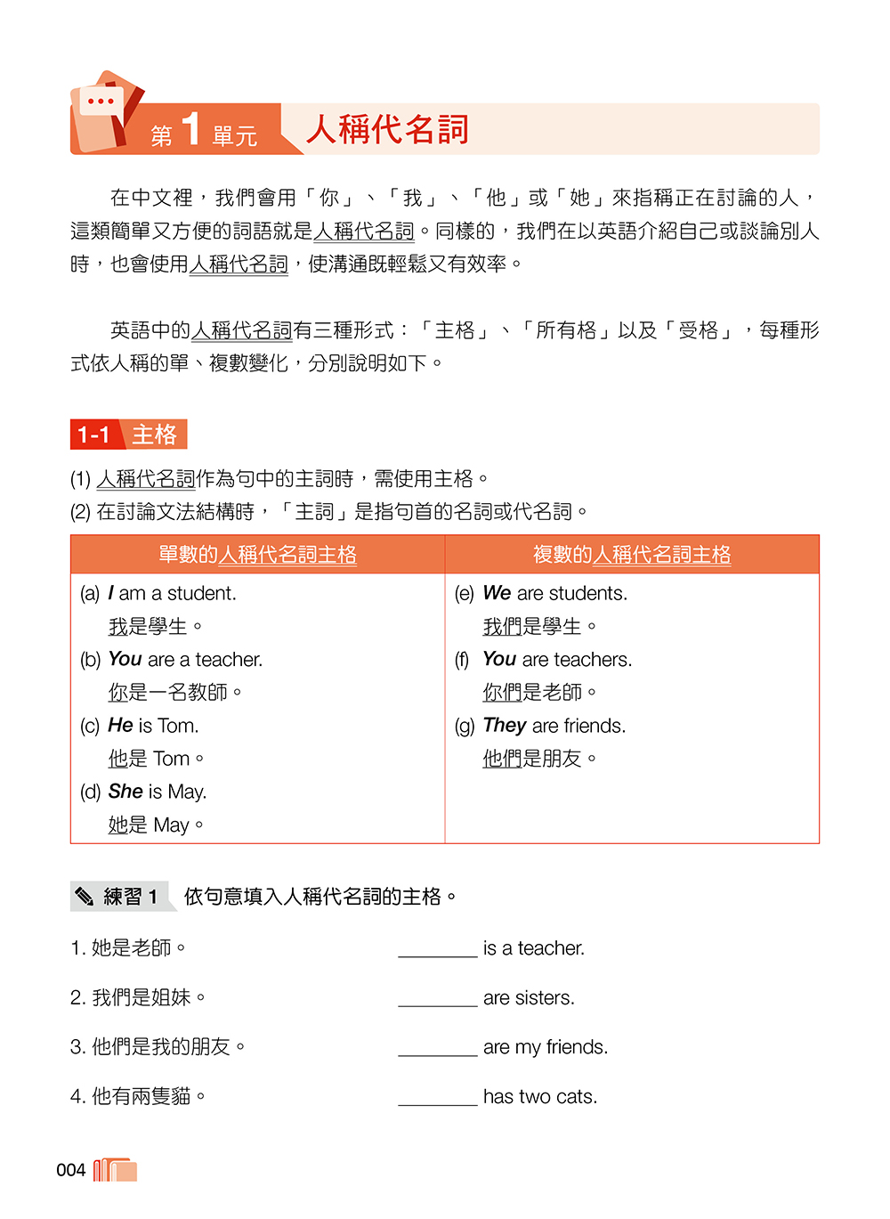 本書目錄 第一篇 建立文法觀念 第 1 單元 人稱代名詞 第 2 單元 可數名詞的單、複數 第 3 單元 名詞的好朋友──指稱詞/冠詞/形容詞 第 4 單元 be 動詞的常見句型 第 5 單元 be 動詞 + 地點 第 6 單元 There is… / There are… 第 7 單元 現在進行式 第 8 單元 祈使句