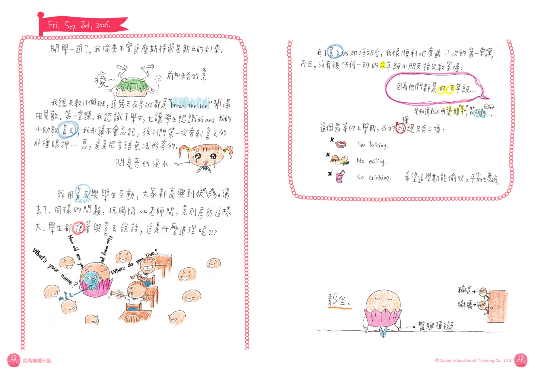 本書的作者米麻糬老師,在成為國小英語教師之後,決定以手繪的彩色圖文,詳盡記錄自己第一年的教學生涯。出乎意料地,菜鳥老師的生活一點都不輕鬆:堆積如山的學生作業、像天使也像惡魔的學生,以及永遠趕不完的教學進度……。所有親身經歷的震撼教育,與令人捧腹大笑的校園妙事,全都記錄在這本有笑有淚的日記裡。