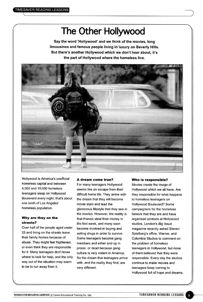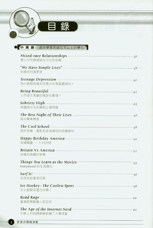 本書收錄各式主題的文章,提供教師進行閱讀教學。例如:親子關係、青少年戀情、種族歧視、壓力調適、控制飲食等。每篇文章皆附有閱讀導引、閱讀活動、延伸活動及可影印的活動頁,從學生閱讀文章前、中、後的每一階段都有配合的活動,讓學生充分了解整篇文章的內容。文章包含許多實用的文法和單字句型,從活動中可以提昇學生的閱讀、寫作、口語等能力,教師可以依學生的程度和興趣,替他們選讀合適的文章。