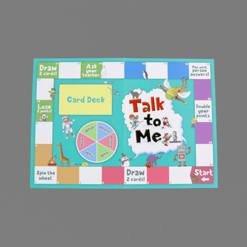 示範教案 1. 先將《Talk to Me口說練習卡》洗勻,放置在桌遊板中央。 2. 依班級人數分組,以不同顏色的走步棋代表各組。 3. 學生先擲骰子,並依數字前進至指定的格子內,空白格就抽一張卡牌,功能格則依照其指令進行任務或抽牌。 4. 正確回答問題或說出句子即完成任務,得到卡牌上的分數。 5. 走到轉指針的格子時,根據疑問詞從「問題提示」挑選一題來回答或造相關問句,並得到兩分。 6. 得分最多組別即獲勝。