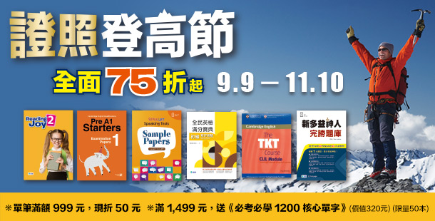 全民英檢滿分寶典 初級寫作測驗 (30回寫作測驗練習 + 文法重點表)優惠價 $315 定價 $399 【杜哲宏作品全套最優惠】新制 全民英檢中級聽力一本通 + 初級聽力一本通 + 寫作口說一本通優惠價 $730 定價 $989 全民英檢滿分寶典 中級聽力測驗(10回全真聽力試題+解析+QR CODE隨掃即聽)優惠價 $315 定價 $399 建構式黃金文法-基礎篇(附QR CODE音檔隨掃即聽)優惠價 $299 定價 $379 建構式黃金文法-進階篇(附QR CODE音檔隨掃即聽)優惠價 $299 定價 $379 全民英檢滿分寶典 中級單字與片語(QR code音檔+30回題庫及片語總整理光碟)優惠價 $315 定價 $399 全民英檢滿分寶典 初級文法與練習(附贈解析子母書)優惠價 $299 定價 $379 全民英檢滿分寶典 中級文法與練習(附贈解析子母書)優惠價 $315 定價 $399 全民英檢滿分寶典 中級閱讀測驗(最新改制題型)優惠價 $315 定價 $399 全民英檢滿分寶典 初級單字與片語(QR CODE音檔+32回測驗題庫)優惠價 $315 定價 $399 全民英檢中高級全真題庫(5回模擬試題+解析+QR CODE隨掃隨聽)優惠價 $276 定價 $349 全民英檢初級聽力一本通(附高分實戰QR CODE隨掃隨聽音檔)優惠價 $253 定價 $320